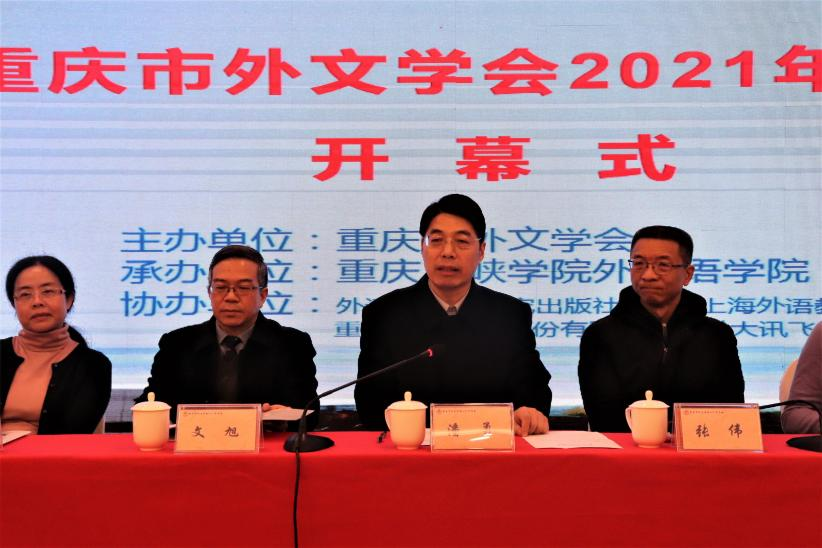 2021年12月18日至19日,重庆市社科界第七届学术年活动资助项目——重庆市外文学会2021年年会暨第五届琼渝黔“外语教育高层论坛”在万州顺利召开。会议由重庆市外文学会主办,重庆三峡学院外国语学院承办,外语教学与研究出版社、上海外语教育出版社、高等教育出版社等单位协办。重庆市社科联党组成员、副主席潘勇,市社科联学会学术部副部长陆玫,重庆市外文协会会长文旭,副会长彭静、吴显友、王仁强、毛明勇、张绍全,秘书长黄健平,副秘书长莫启扬出席会议。来自西南大学、四川外国语大学、重庆交通大学等多所高校共一百余名专家学者、院系领导和常务理事参加了本次会议。