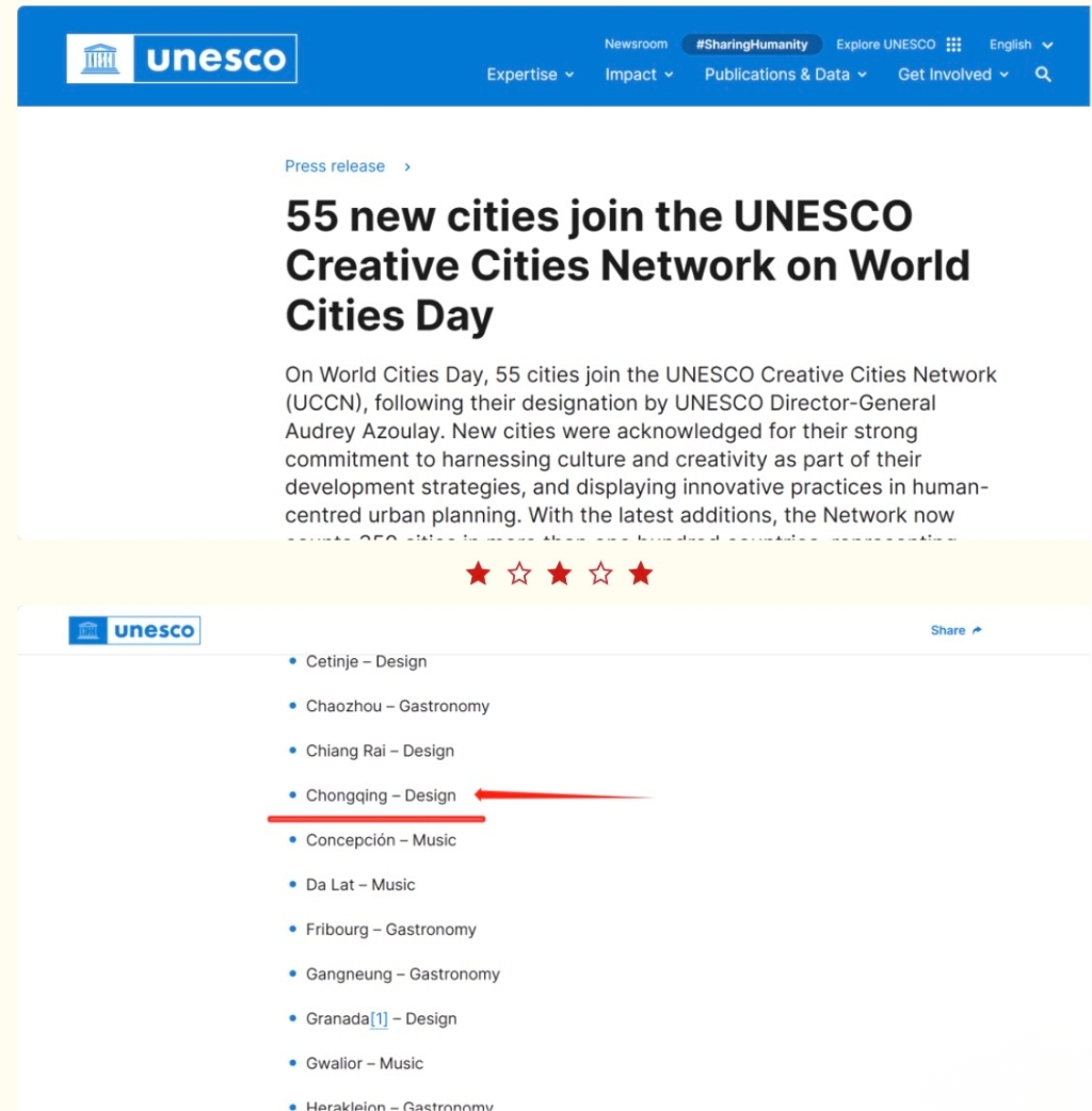 巴黎时间2023年10月31日下午,联合国教科文组织官方网站公布,重庆市正式入选2023年全球创意城市网络“设计之都”,成为继深圳、上海、北京、武汉之后的中国第五、西部第一个“设计之都”。重庆在原有的城市定义上,又多了一张世界级名片“全球设计之都”。