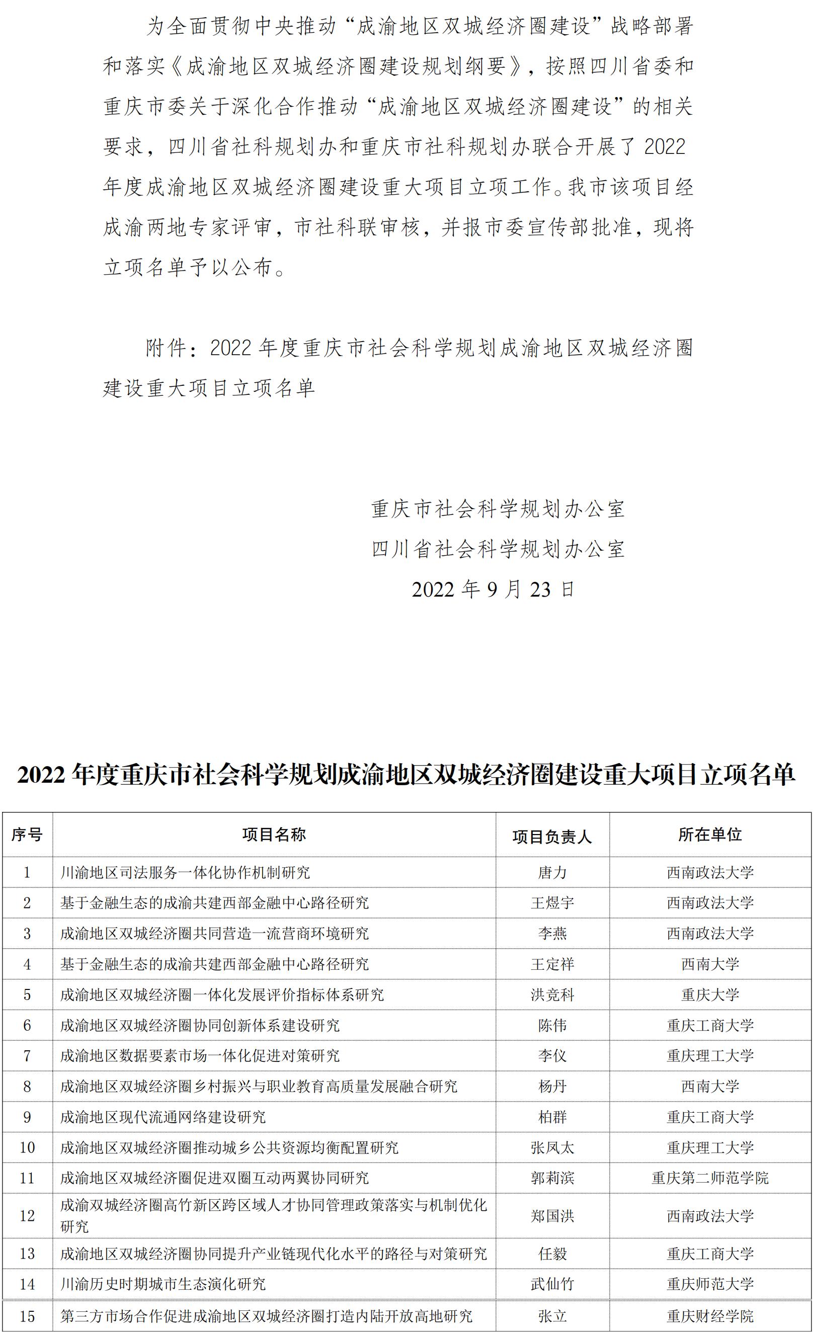 2022年度重庆市社会科学规划成渝地区双城经济圈建设重大项目立项名单