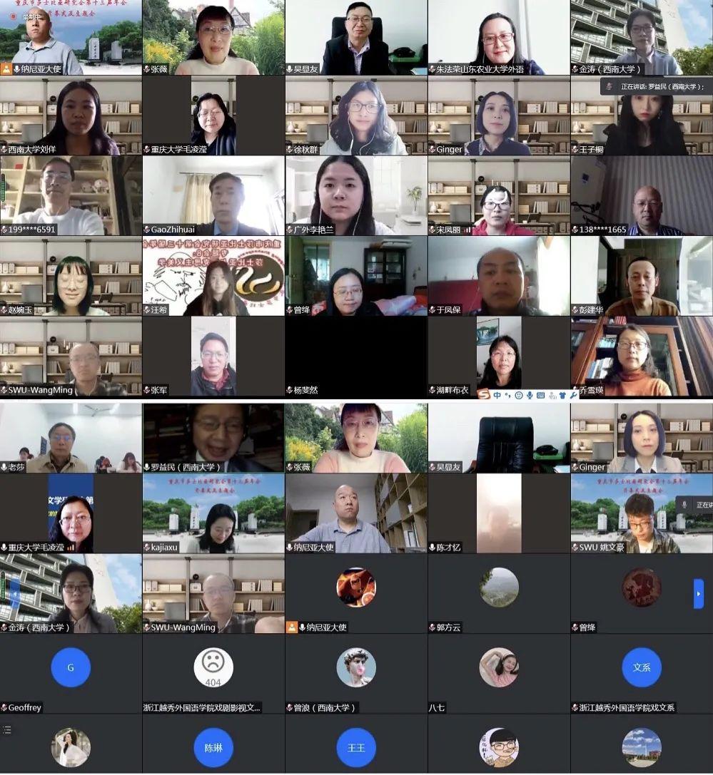 2021年4月23日,由重庆市莎士比亚研究会主办,西南大学外国语学院承办,西南大学莎士比亚研究中心、《莎士比亚评论》编辑部(筹)协办的重庆市莎士比亚研究会第十三届年会采取线上形式如期举行。来自清华大学、北京师范大学、中国人民大学、上海交通大学、上海外国语大学、四川大学、重庆大学、四川外国语大学以及东道主西南大学等四十三所高校的百余名专家学者参加了此次盛会。