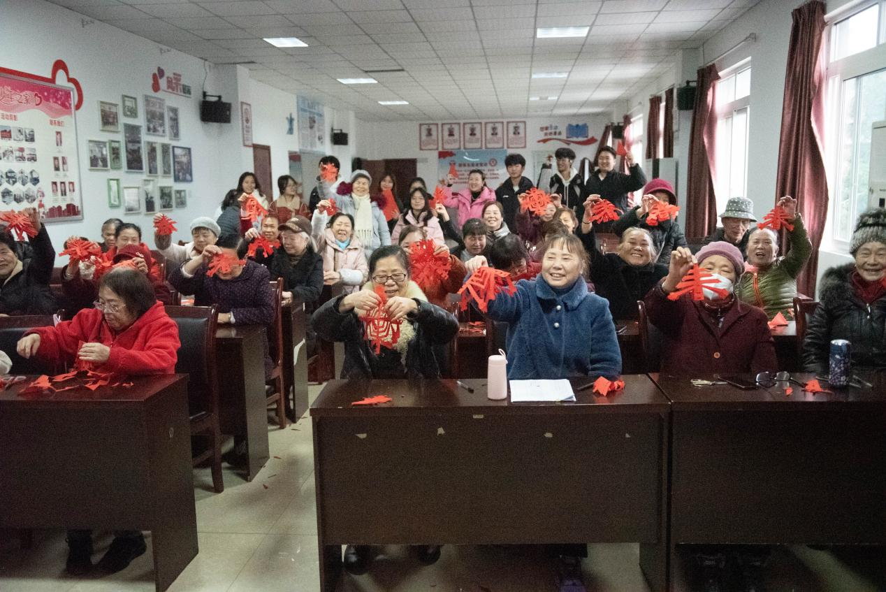 科普宣讲结束后,同学们为每一位老人发放红色宣纸,在朱红、李莉莎和刘思甜等志愿者的协助下,大家一边讲解一边示范如何叠红纸以及如何在红纸上面画图案,做到每一个步骤都清晰易懂。现场群众充满热情,用心制作,积极配合,都剪出了属于自己的红色的“春”。