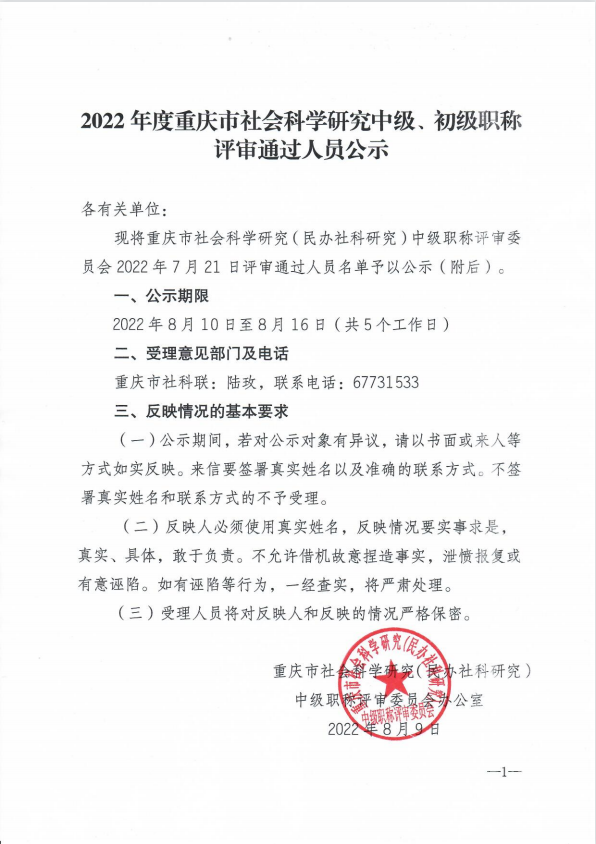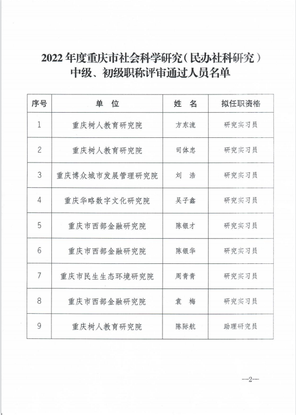 2022年度重庆市社会科学研究中级、初级职称评审通过人员公示